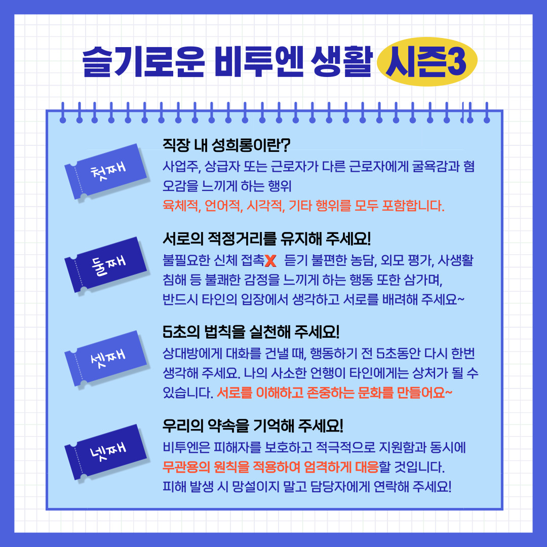 아래 콘텐츠를 통해 비투엔 직원들이 지켜야 할 기본적인 매너와 성희롱 예방 캠페인에 대해 확인할 수 있습니다.