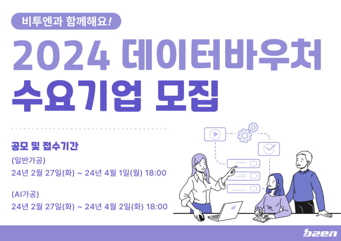 비투엔(대표이사 안태일)은 과학기술정보통신부와 한국데이터산업진흥원에서 주관하는 '2024년 데이터바우처 지원사업' 수요기업을 모집한다고 11일 밝혔다.