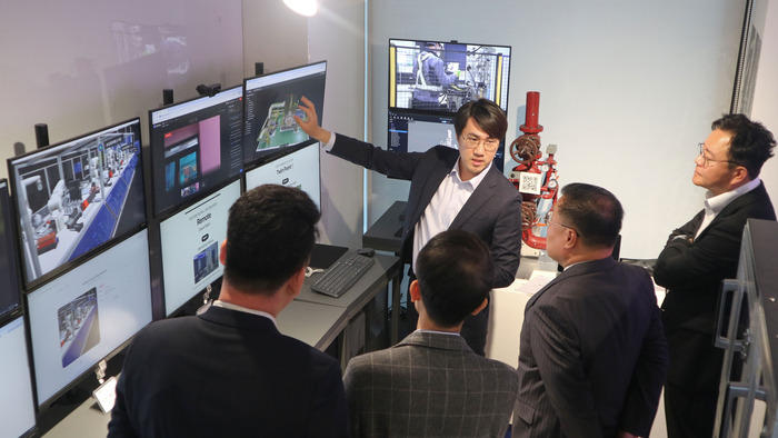 하태진 버넥트 대표(가운데)가 11일 버넥트 사옥 내 쇼룸에서 비투엔 관계자를 대상으로 XR 솔루션을 시연하고 있다. 사진=비투엔 제공