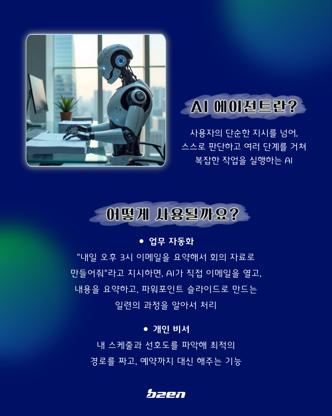 개념 설명: 사용자의 단순한 지시를 받아 스스로 판단하고 계획을 세워 복잡한 일련의 작업을 최종 목표까지 실행하는 AI입니다.
